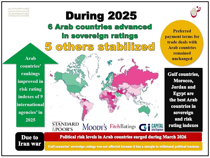 على الرغم من التوترات الجيوسياسية، سجلت الدول العربية خلال عام 2025 تحسنًا ملحوظًا في التصنيفات السيادية ومؤشرات المخاطر السياسية والتجارية، خاصة مع استمرار الضغوط في فلسطين ولبنان وسوريا والعراق واليمن والسودان والصومال.