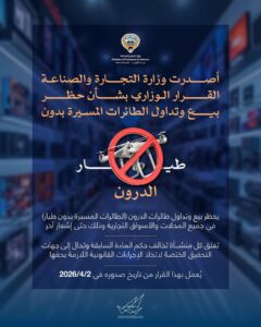 أعلنت وزارة التجارة والصناعة في الكويت إصدار قرار وزاري يقضي بحظر بيع وتداول الطائرات المسيّرة (الدرون) في جميع المحال والأسواق التجارية، وذلك حتى إشعار آخر.
